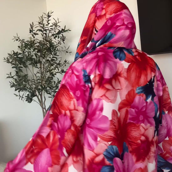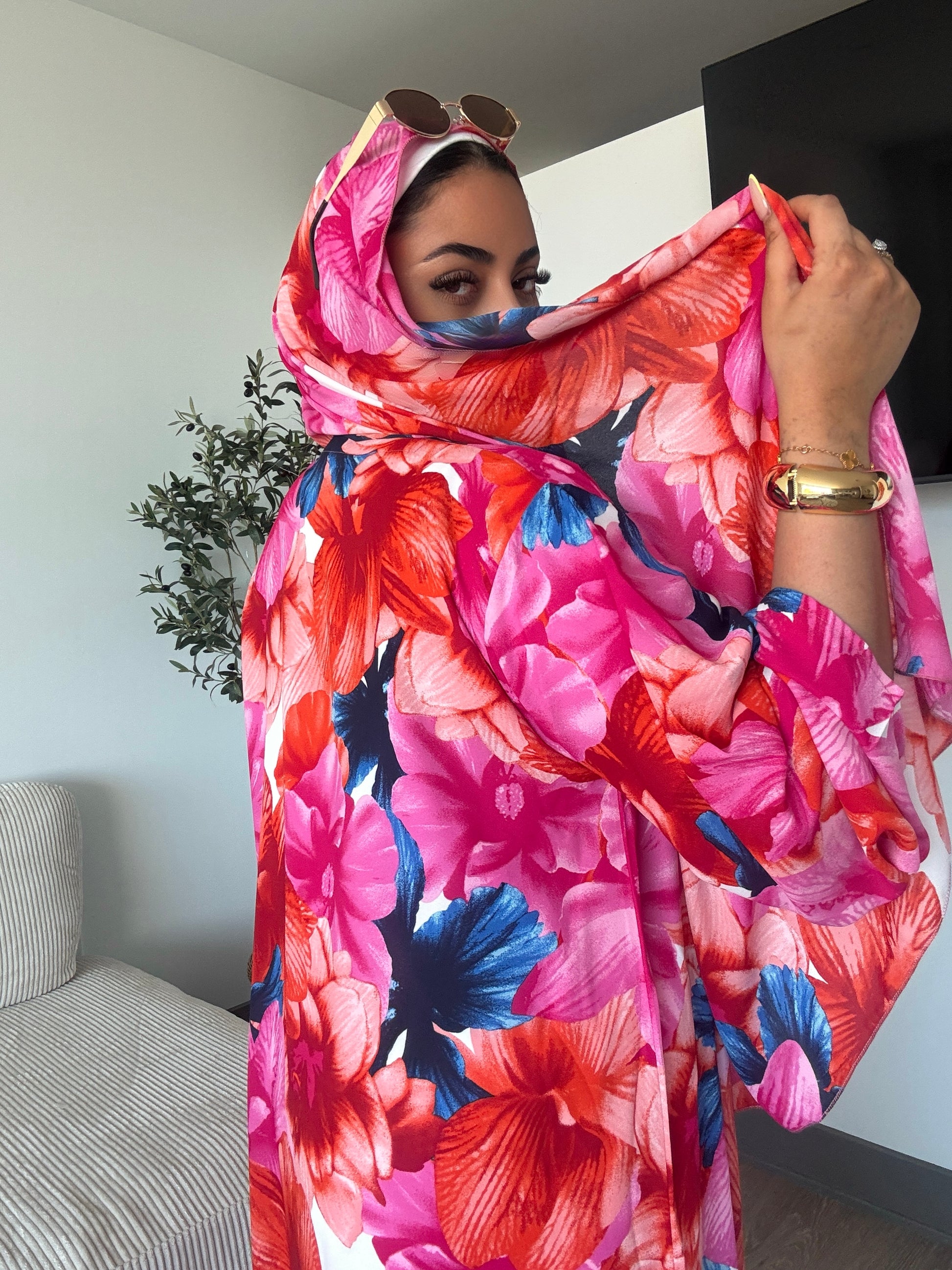 Bold and stunning 4 piece abaya set which includes your tropical abaya with matching hijab, white under lay, and a belt ! Made in Dubai 🌺